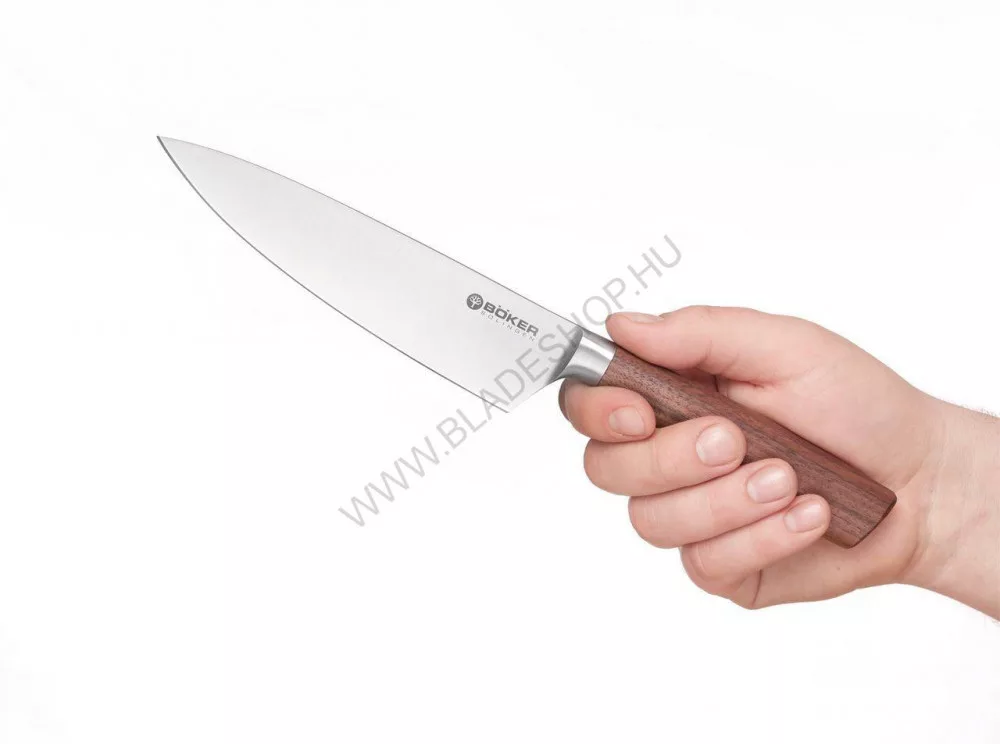 A Core család kifejlesztésének célja az volt, hogy a Böker közel 150 éves tapasztalatát felhasználva egy olyan késcsaládot hozzon létre, mely a főzés szerelmeseinek minden igényét kielégíti. Az eredmény egy dinamikus vonalvezetésű, kényelmes, jól irányítható kés lett rendkívüli vágóteljesítménnyel. Pengéjét egyetlen darab króm vanádium molibdén ötvözetből (X50CrMoV15) kovácsolják kézzel Solingenben, majd pedig az ideális 58 HRc-re hőkezelik. Felülete polírozott a megnövelt élettartam és mégjobb vágóképesség érdekében. A kovácsolt bakni garantálja a jó fogást és biztonságos használatot. A kés gerince lekerekített, ami hozzájárul a kényelmes használathoz bármely fogásnemben, és nem vágja a kezet akkor sem, ha közvetlenül a pengehátra kell erőt kifejtenünk. Kényelmes markolata gyönyörű diófából készült. A séfkés a konyhai felszerelés alapja. Hosszú és széles pengéje egyaránt alkalmas különböző zöldségek és húsok feldolgozására.